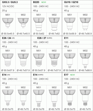 E11, E14, E26/27, E26/24, GU10/GZ10, GX5.3/GU5.3, E17, B22D